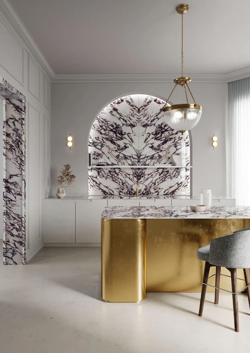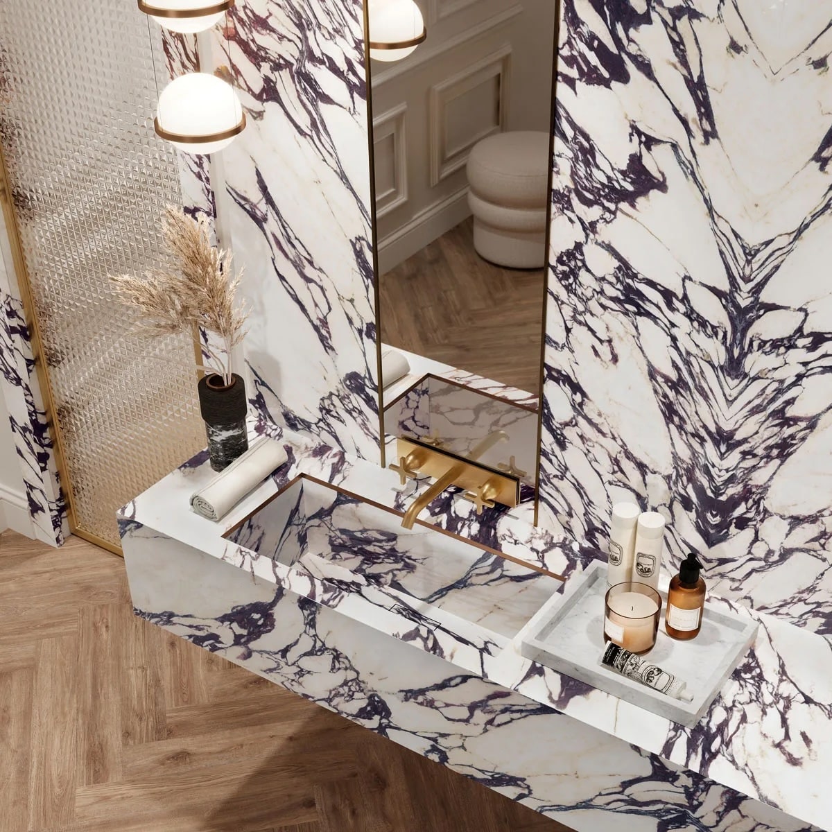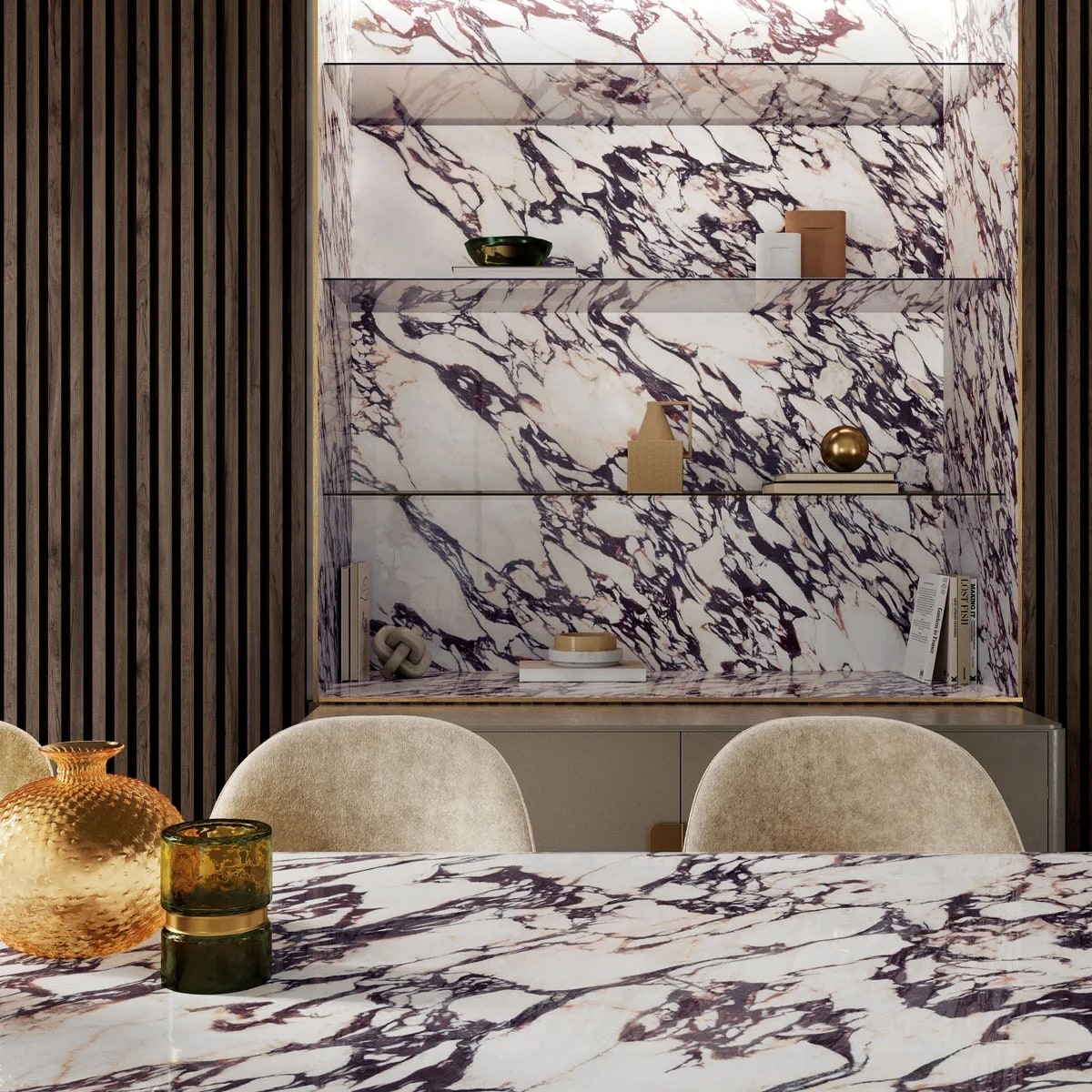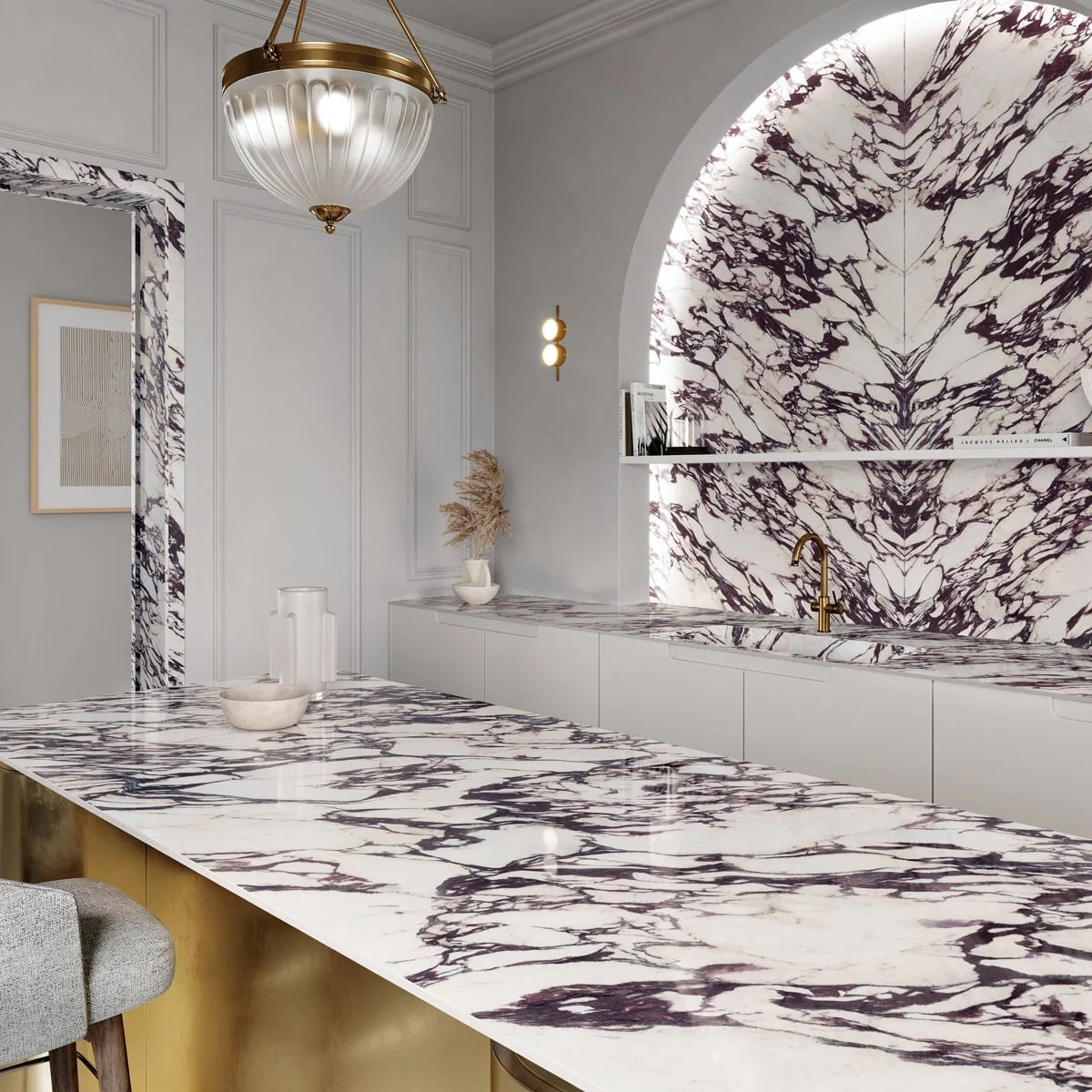 En lyxig keramisk bänkskiva som på ett perfekt sätt återskapar det djärva och dramatiska uttrycket hos naturmarmorn med samma namn. Den varmvita grundtonen hos Infinity Calacatta Viola genomkorsas av intensiva violetta ådror och gyllene nyanser, vilket skapar slående kontraster och ger karaktär åt interiören.