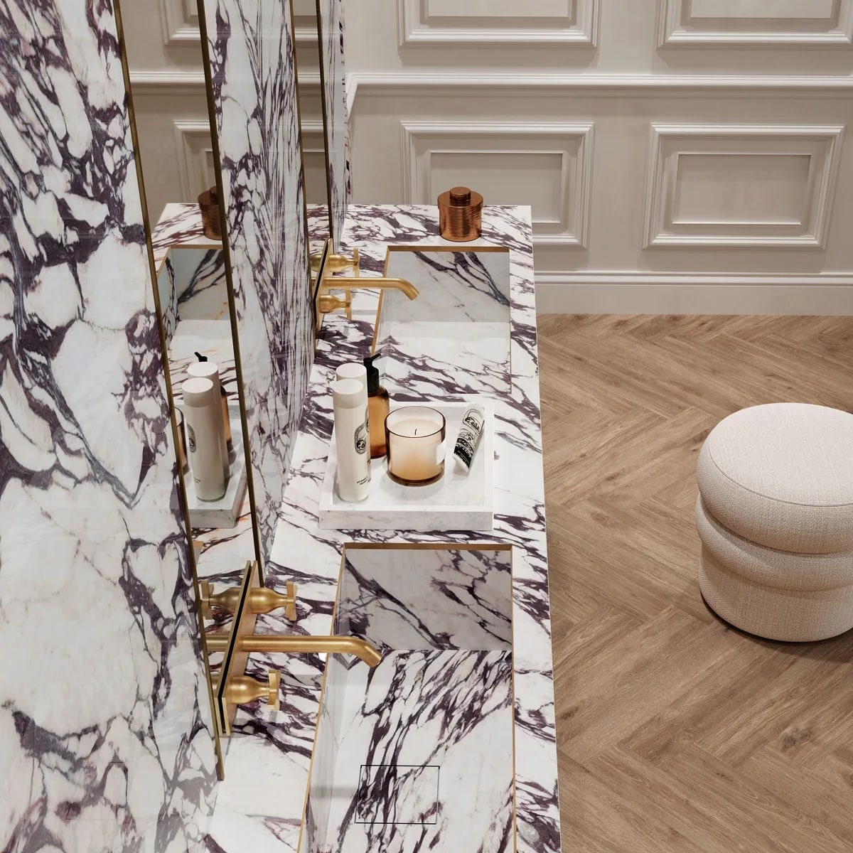 Detta keramikmaterial förenar naturstenens vackra estetik med de bästa egenskaperna hos moderna material. Det är ett idealiskt val för exklusiva hem med höga krav – skivan erbjuder det ikoniska utseendet hos äkta Calacatta Viola, samtidigt som den är extremt hållbar, fläcktålig och lättskött i vardagen.